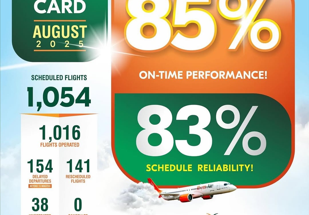 Ibom Air Score Card August 2025: Scheduled Flights: 1,054 Flights Operated: 1,016 Delayed Departures (beyond 15 minutes): 154 Rescheduled