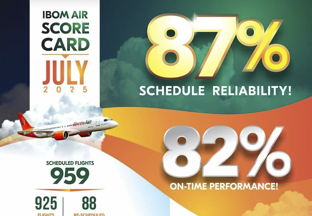 Ibom Air Score Card July 2025: Scheduled Flights: 959 Flights Operated: 925 Delayed Departures (beyond 15 minutes): 170 Rescheduled Flights: 88