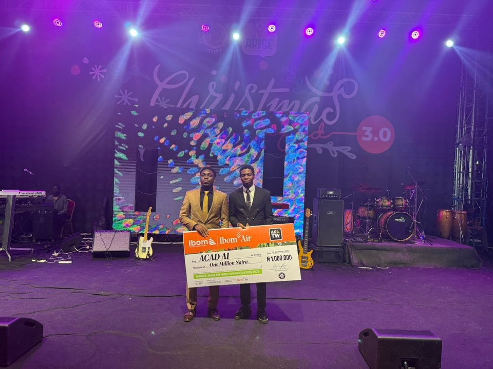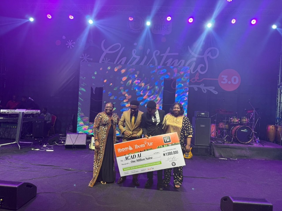 Last Sunday, at our Ibom Air Day celebration at the Christmas Park, we had the honour of officially presenting the ₦1,000,000 prize to Nsikak and Philip Ebong, the founders of ACAD AI and the winners of the Ibom Air Prize for Innovation Challenge at Akwa Ibom Tech Week 2025.